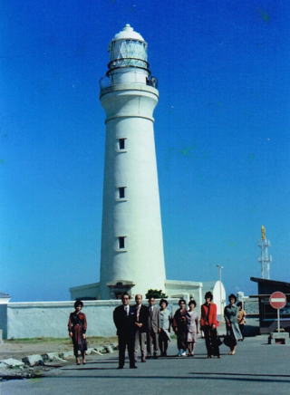| 干潮どきに、犬吠埼灯台と長崎海岸沖の宝満島最左端の安山岩とのツーショット写真 この岩礁は2000万年前噴出した溶岩が流動しつつ冷えて固まったもの 風化は見られない |