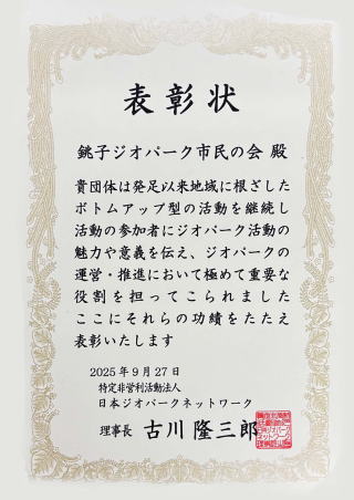 銚子ジオパーク市民の会の 多年にわたる銚子半島海岸清掃美化活動が評価されました 令和3年7月27日表彰式が行われ 当会から工藤忠男会長がナルク銚子さんとともに出席しました |