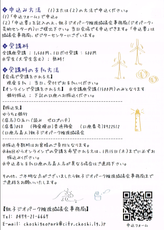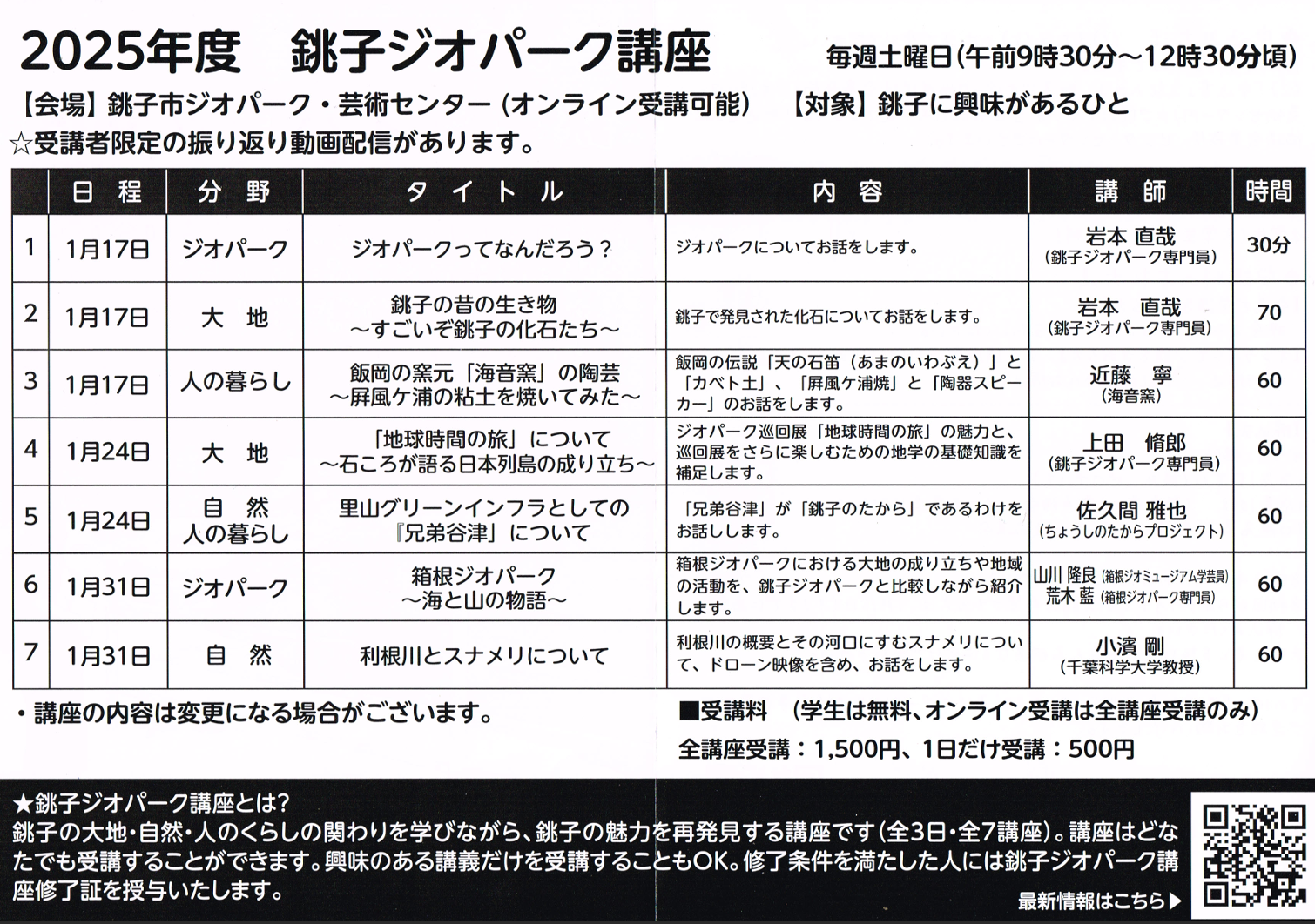 | 2026/0110 | 主催 銚子ジオパーク推進協議会 2025年度 銚子ジオパーク講座開催のお知らせ |